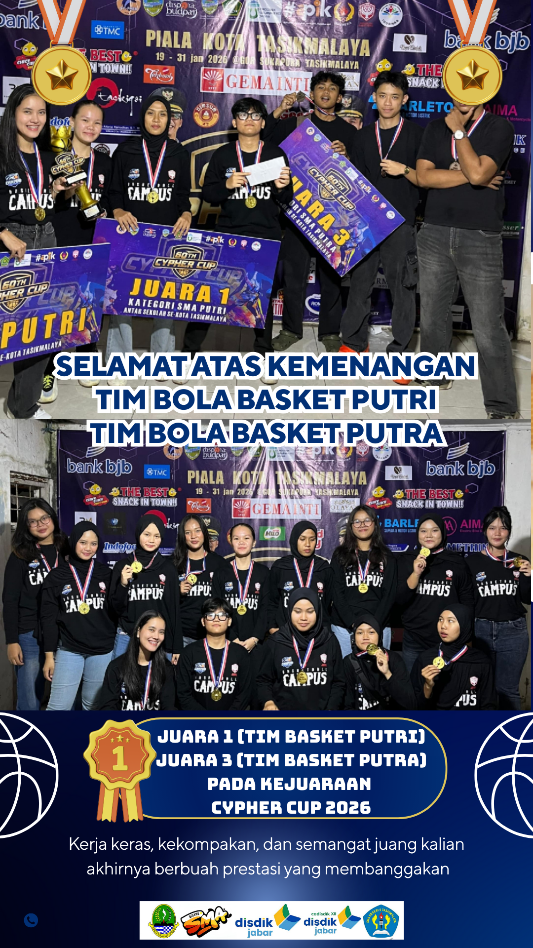 Perjuangan pantang menyerah para siswa/i SMAN 5 Tasikmalaya kembali membuahkan hasil manis. Tim bola basket putri berhasil menyabet Juara 1, sementara tim putra meraih Juara 3 pada ajang bergengsi Cypher Cup 2026.