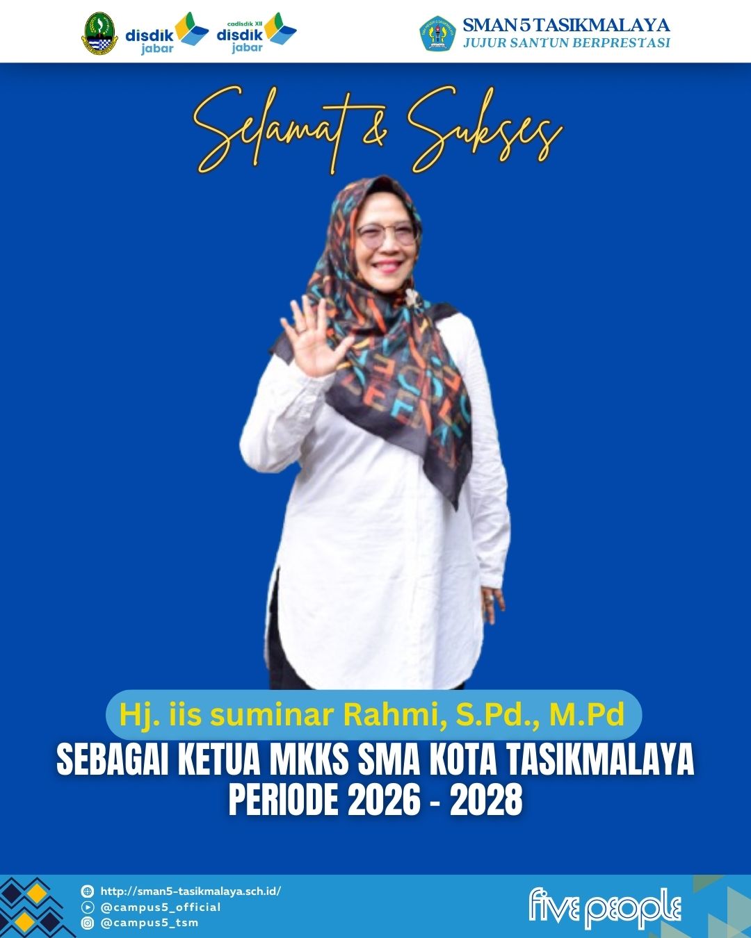 Puji syukur ke hadirat Allah SWT yang telah memberikan kepercayaan besar kepada Ibu Hj. Iis Suminar Rahmi, S.Pd., M.Pd., Kepala SMA Negeri 5 Tasikmalaya, terpilih sebagai Ketua Musyawarah Kerja Kepala Sekolah (MKKS) SMA Kota Tasikmalaya Periode 2026-2028.