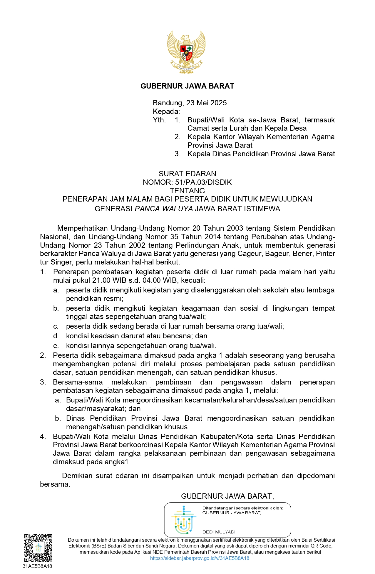 SMA Negeri 5 Tasikmalaya resmi memberlakukan kebijakan jam malam bagi siswa mulai 1 Juni 2025, sesuai dengan Surat Edaran Gubernur Jawa Barat Nomor 51/PA.03/Disdik yang diterbitkan pada 23 Mei 2025. Kebijakan ini bertujuan membentuk generasi Panca Waluya, yaitu siswa yang sehat (cageur), berbudi pekerti (bageur), berintegritas (bener), berpengetahuan (pinter), dan cekatan (singer).